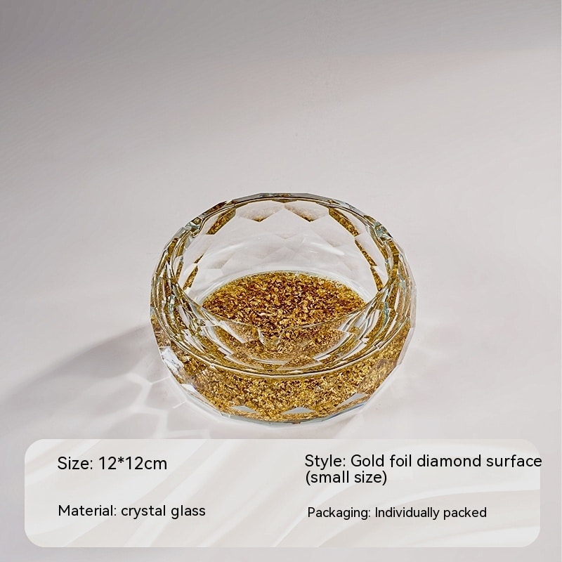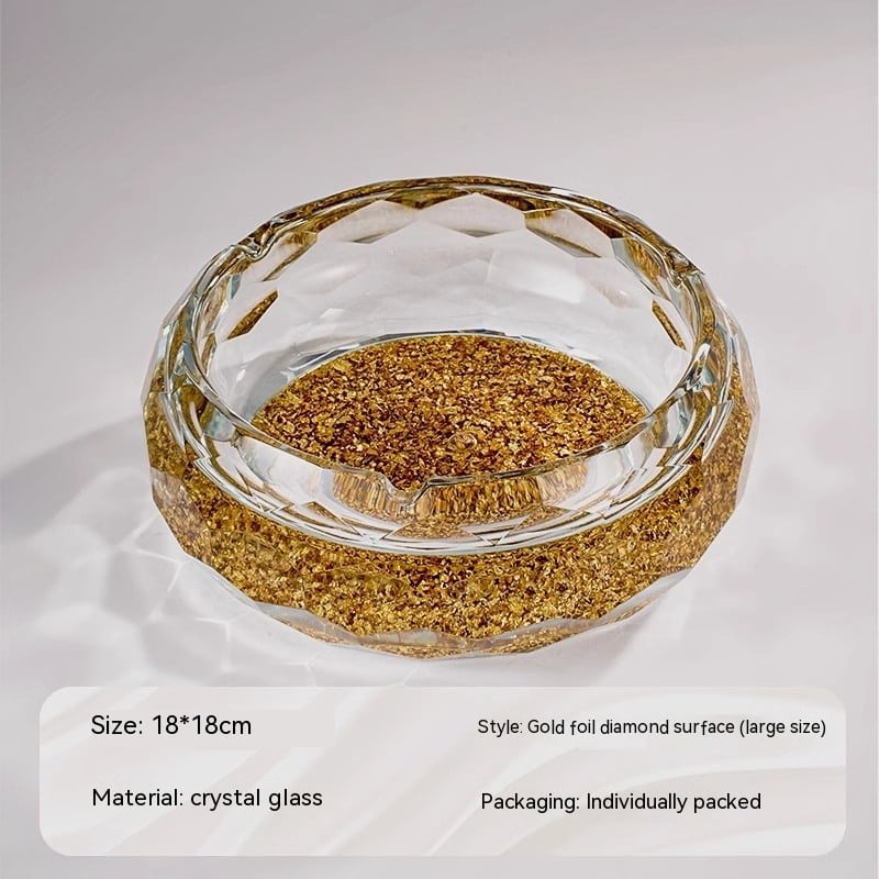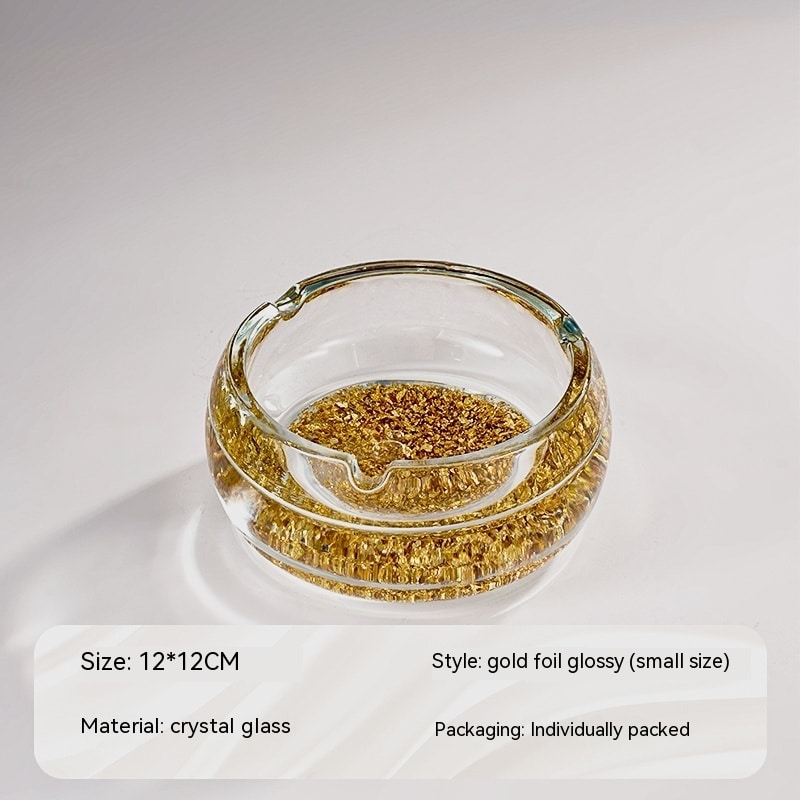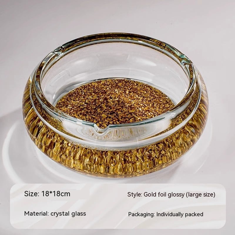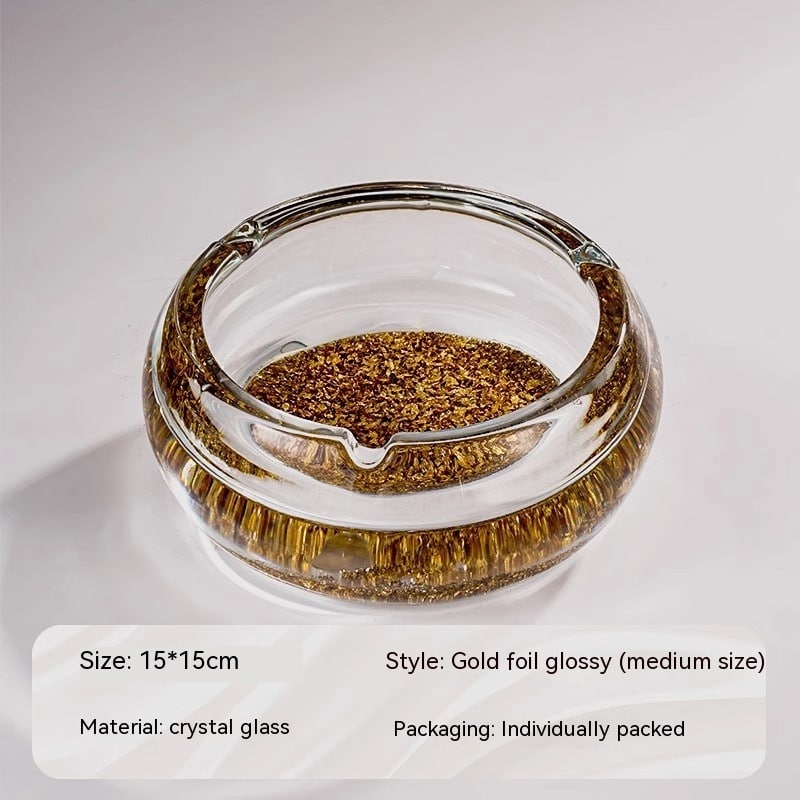 - Design: Transparent glass with decorative golden flakes visible on the bottom