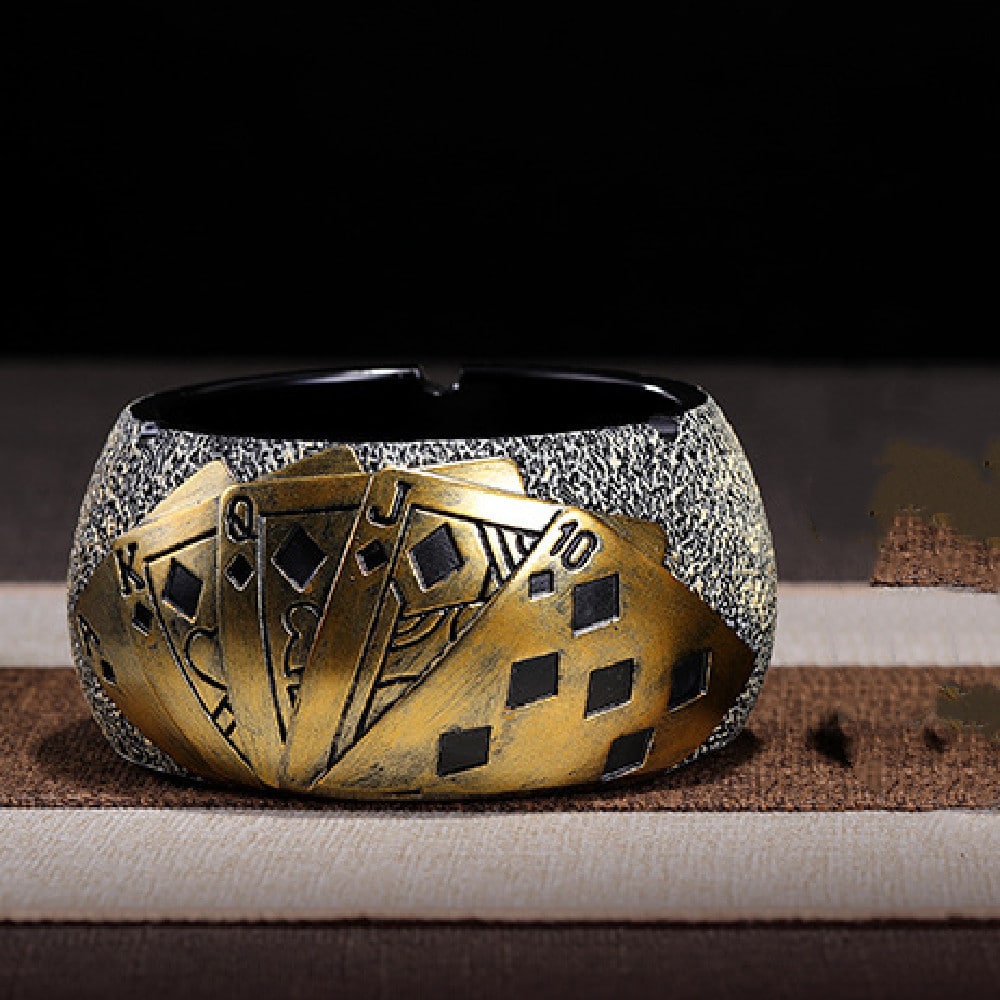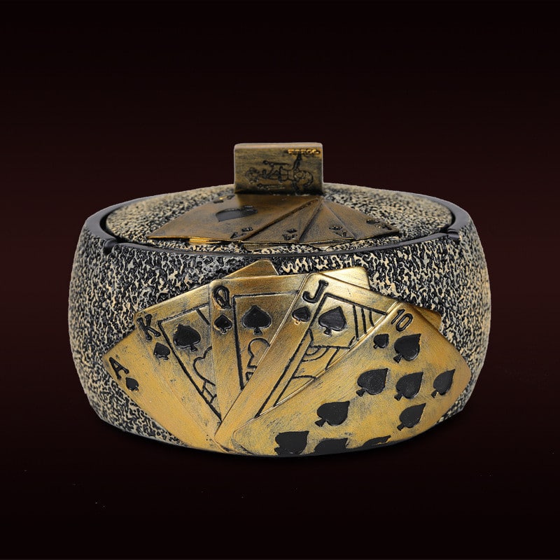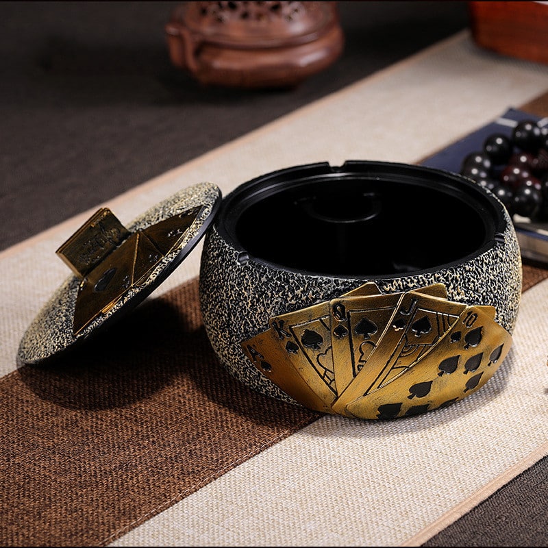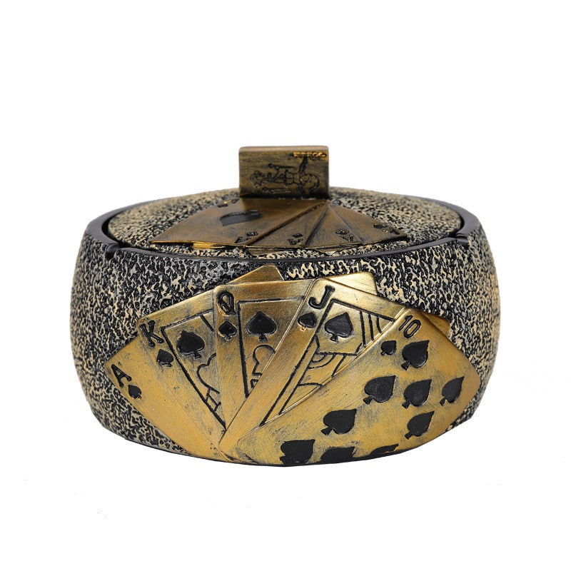 Add a unique touch to your collection with the Cool Playing Cards Ashtray. Made from durable resin and featuring printed playing cards on the side, this golden, elegant ashtray with a lid is perfect for those who appreciate both style and functionality. Whether for personal use or as a gift, this ashtray brings a playful and classy vibe to any space.