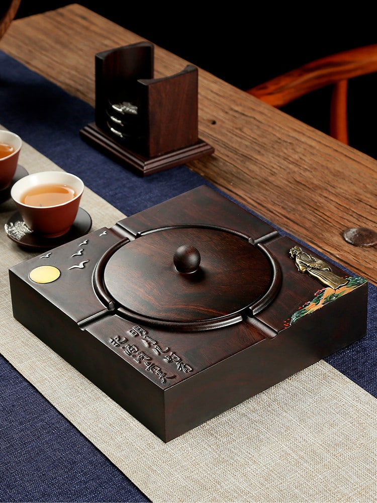 The Elegant Ebony Wood Ashtray is a sophisticated and functional accessory, designed for both cigars and cigarettes. Featuring a covered lid to keep ashes contained and odors at bay, it combines luxury with practicality. Perfect for indoor or outdoor use, this ashtray adds a touch of class to any space.
